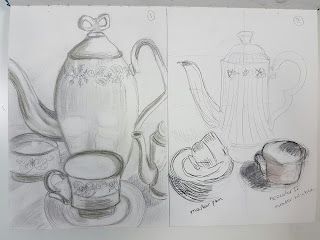 Overall, I think the composition is pleasing as it tends to 'flow', drawing the eye to the teapot and then going round clockwise. In terms of shading I used hatching, contour shading, smudging and some cross hatching, but that's not clearly visible as I used a very fine pencil and the overall effect is more 'smudged' than defined with lines. Where appropriate, I used a darker pencil, pastel or charcoal to define some of the darker areas by going over them a few times and alternating the pressure that I used.